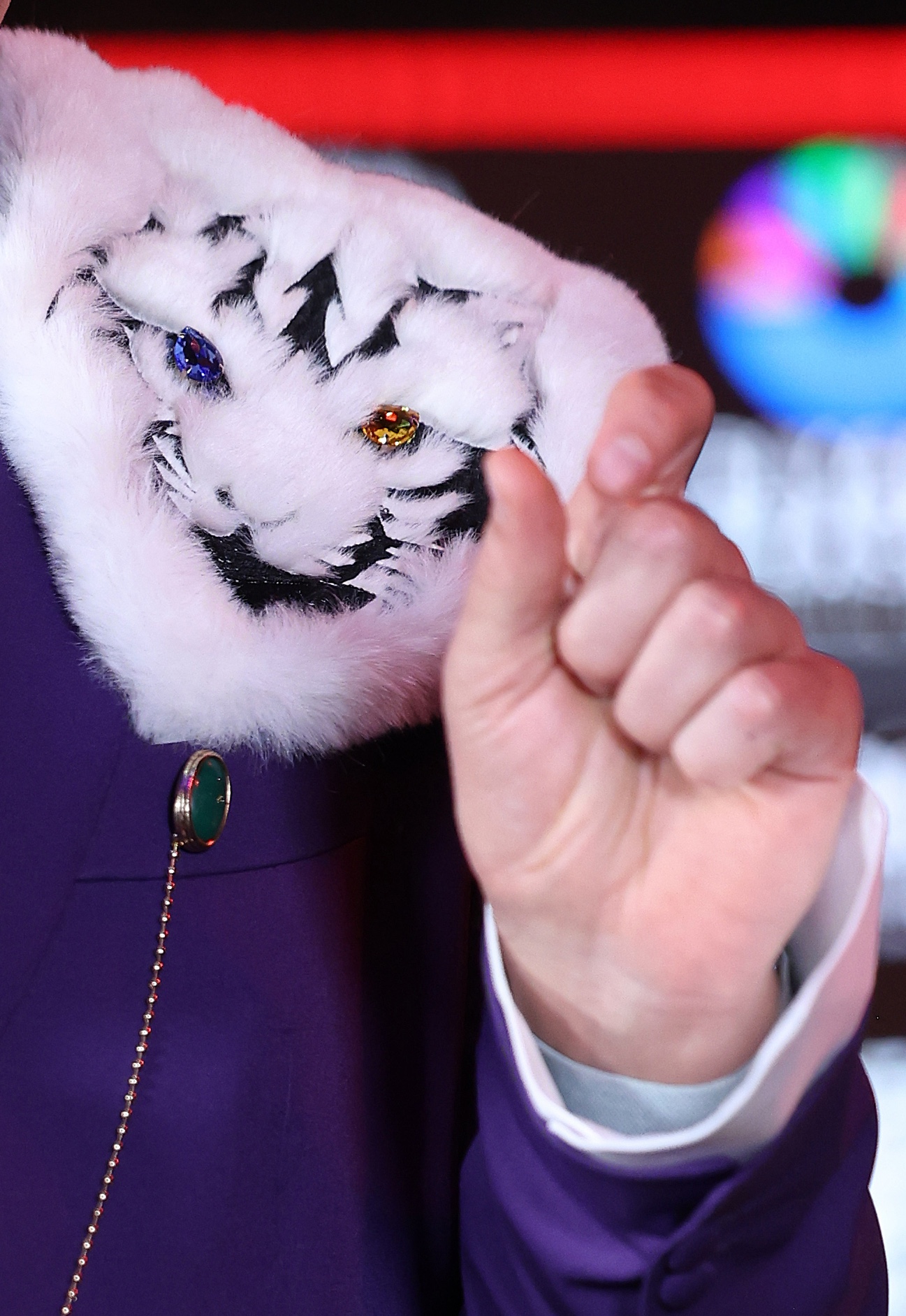 Образ складається із фіолетового костюма та хутряної накидки, на якій вишито зображення тигра. Одне око у тварини жовте, а інше блакитне – це символізм, який вказує на кольори українського прапора.