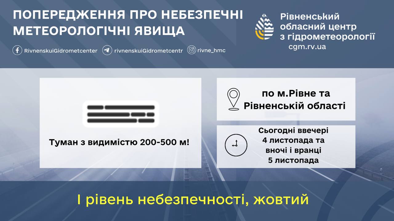 Також синоптики попереджають, що сьогодні ввечері 4 листопада та вночі та вранці 5 листопада очікується туман з видимістю у 200-500м. Перший рівень небезпечності – жовтий.