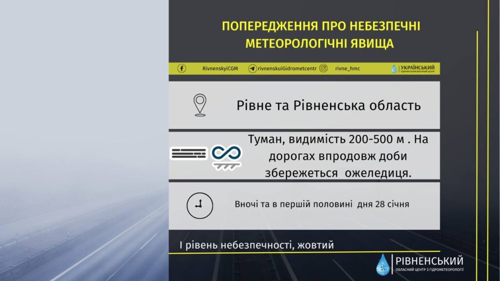 – Хмарно. Невеликий дощ та мокрий сніг. Вночі та в першій половині дня туман з видимістю 200-500м. Слабка ожеледь. На дорогах ожеледиця. Вітер південний, південно-східний, 5-10 м/с, – прогноз на завтра від обласного центру з гідрометеорології.