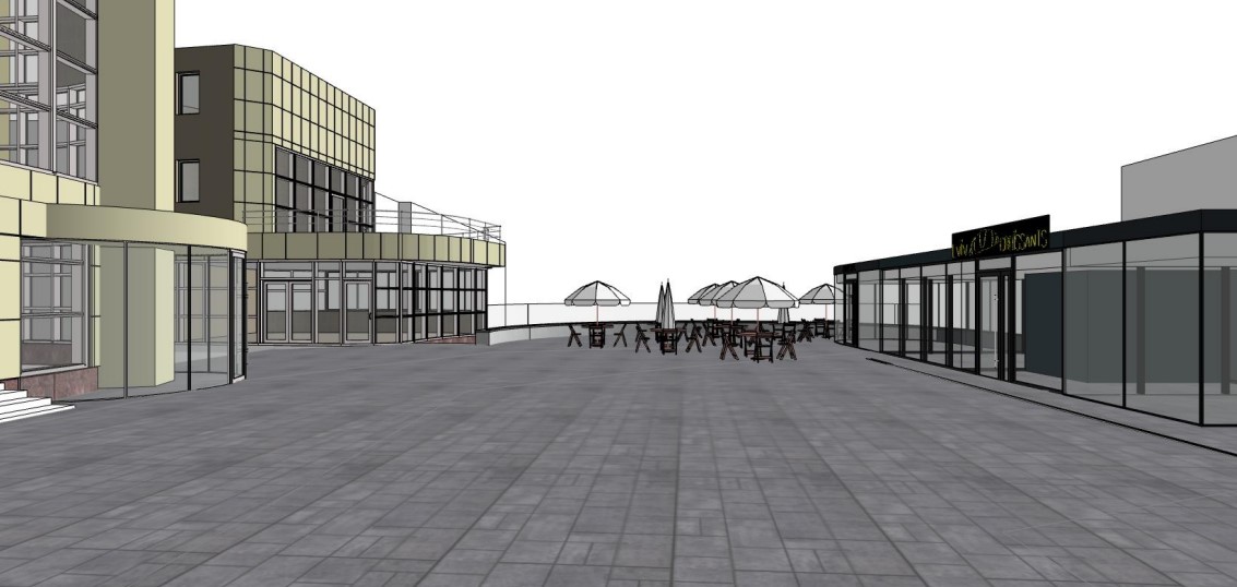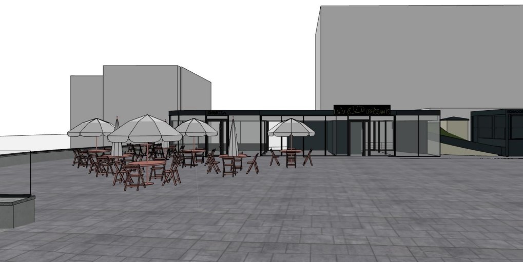 Проект, представлений архітектором Марією Наконечною та розробником Ярославом Некозом, передбачає заміну існуючого масивного літнього майданчика навпроти будівлі на простір з кращою організацією та естетикою.