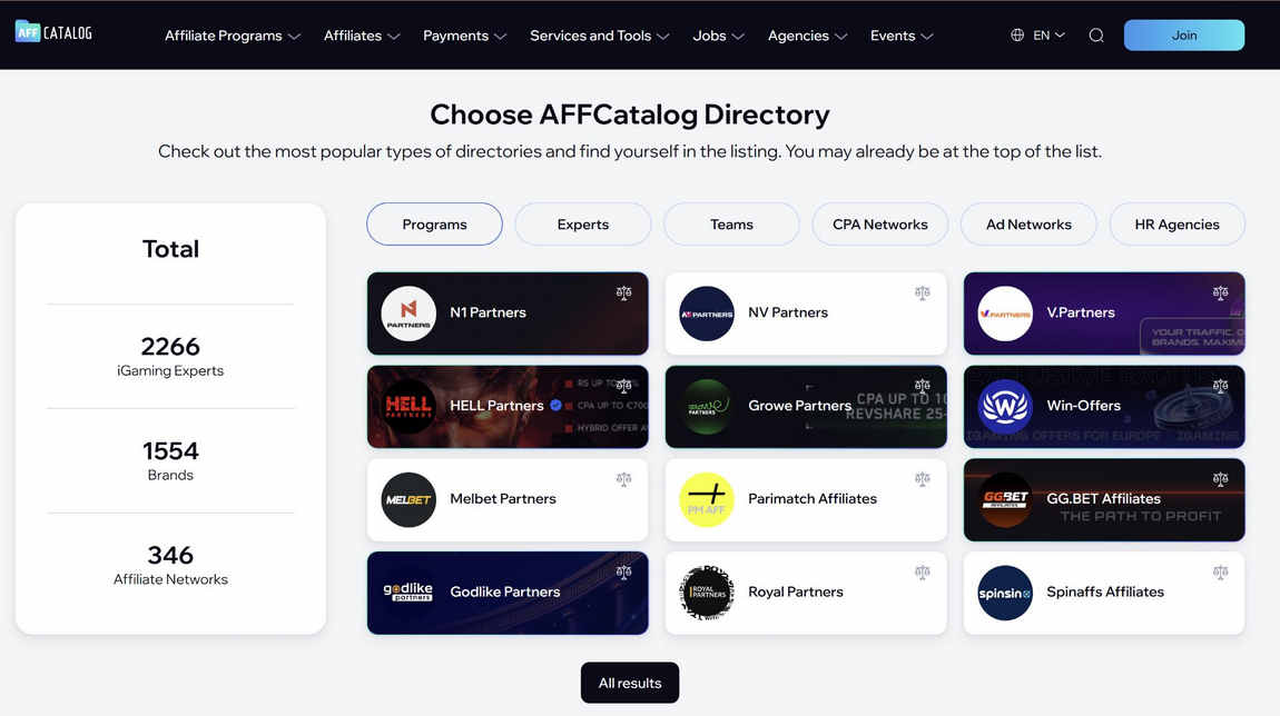 AFFCatalog містить перелік каталогів, присвячених основним нішам партнерського маркетингу: від трекерів і копірайтингових сервісів до експертів галузі та партнерських програм. Система фільтрації налаштована під кожен розділ, ти можеш сортувати пропозиції за: