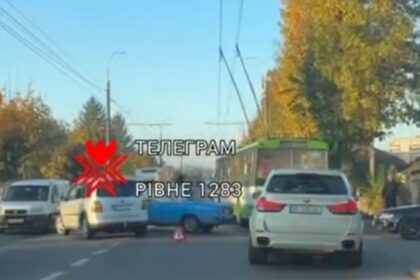 Інші водії автомобілів, тролейбусів та автобусів намагаються обережно об'їхати місце зіткнення.