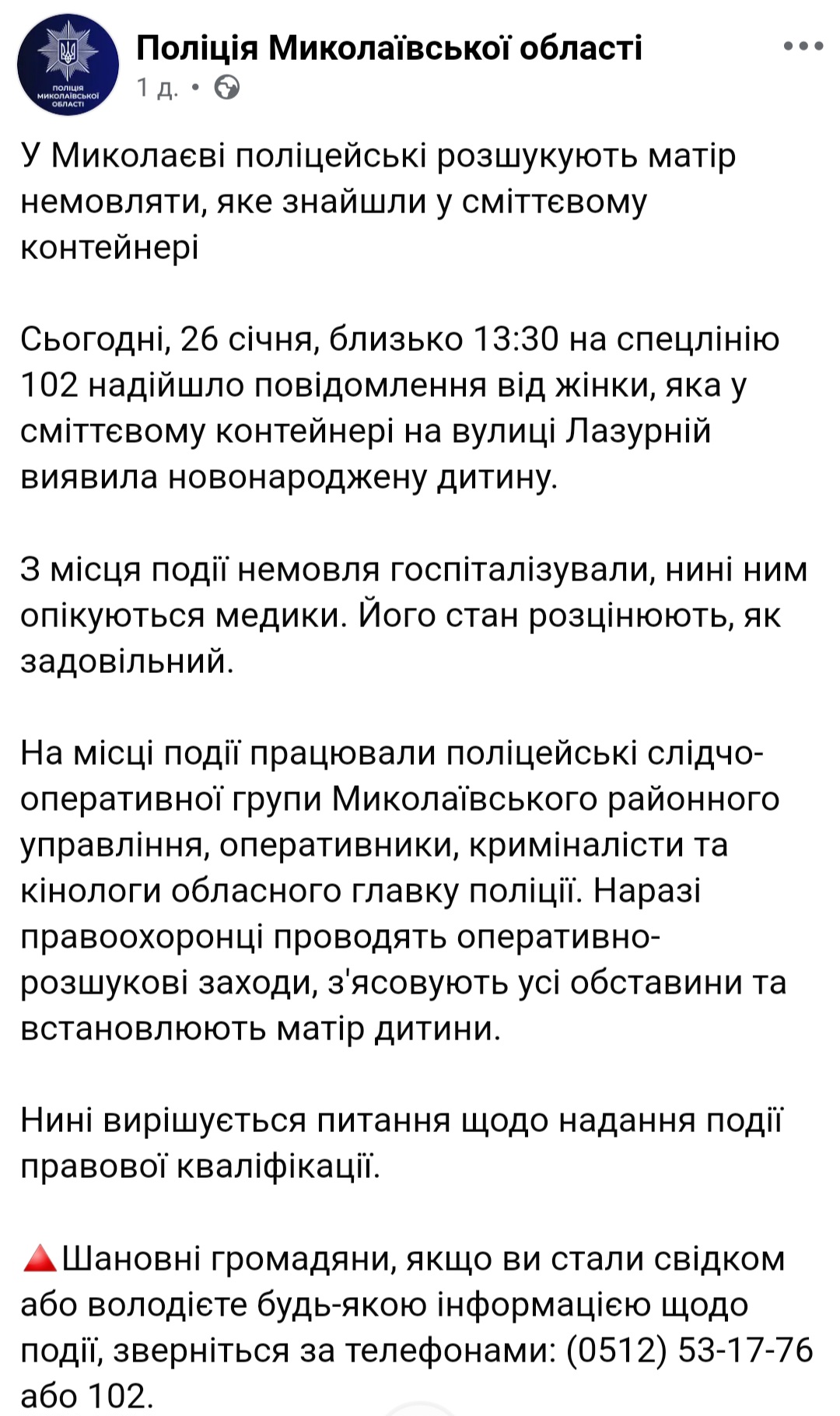 Поліція розшукує матір немовляти, яке викинули у сміттєвий контейнер на вулиці Лазурній у Миколаєві. 26 січня в обід дитя у смітнику помітила інша жінка – і тут же забила на сполох.