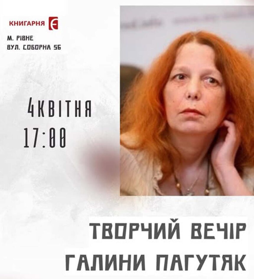 Зустріч з письменницею Галиною Пагутяк відбудеться у суботу, 4 квітня, в книгарні “Є”, що у Рівному на вулиці Соборній, 56 — навпроти майдану Незалежності.