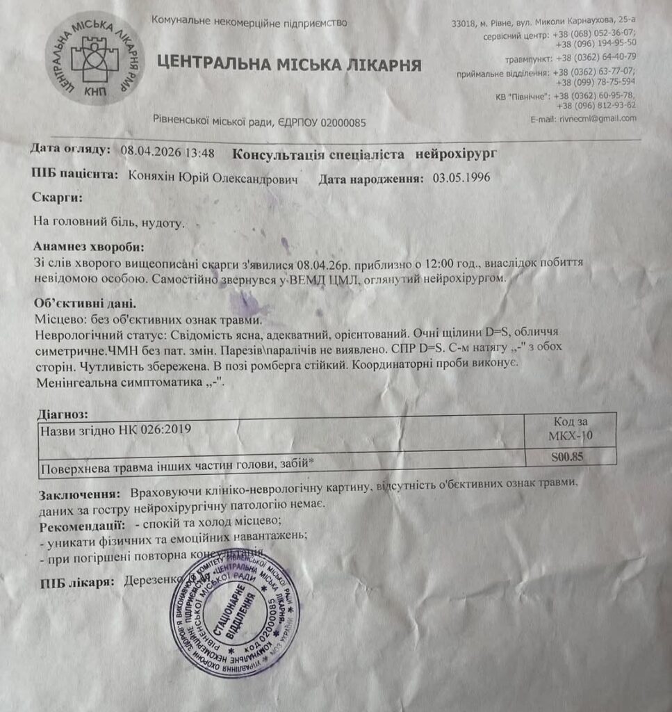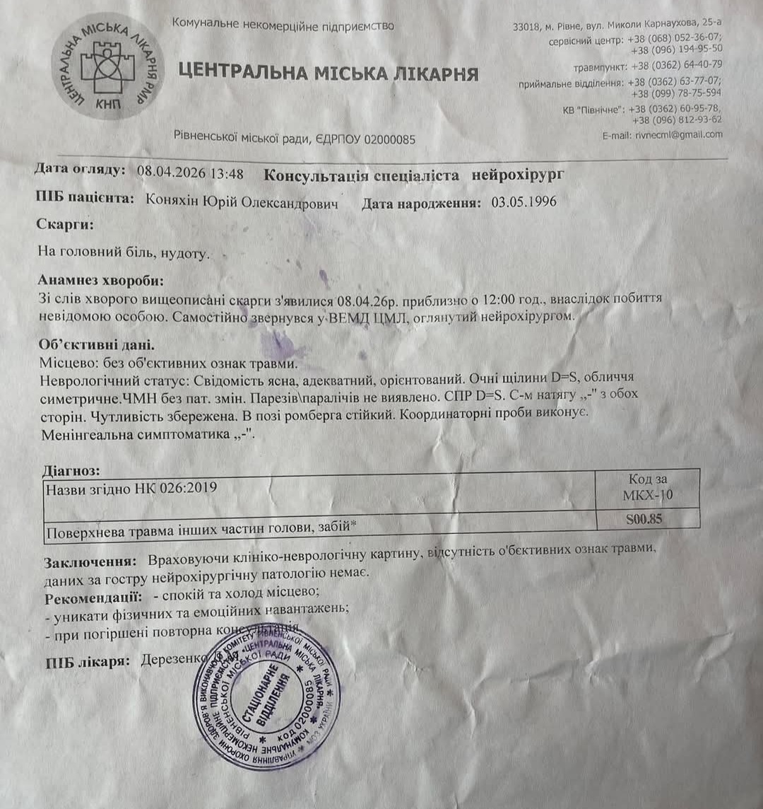 – В самому центрі міста, біля Покровського собору, зі мною стався такий випадок. Я переходив пішохідний перехід, розмовляв по телефону, був у капюшоні через холодну погоду — і раптом отримав сильний удар у праву частину голови. У перші секунди навіть не зрозумів, що сталося.