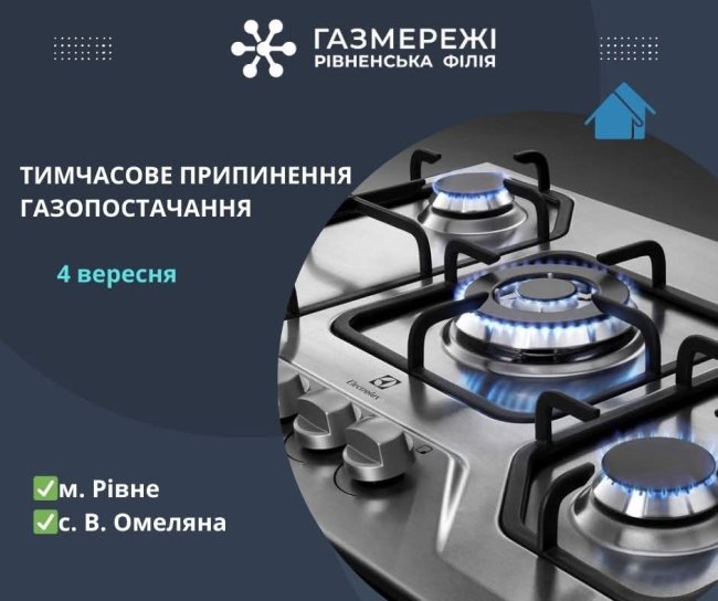 У зв’язку з цим буде тимчасово припинено газопостачання (розподіл природного газу) до 1 комунально-побутового об’єкта та осель 241 споживача природного газу вм. Рівному: