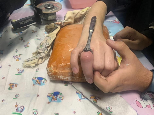 Рятувальники під наглядом медичного персоналу за допомогою акамуляторної болгарки, на малих обертах, дуже обережно зрізали сталеве кільце з набряклого пальця хлопця.