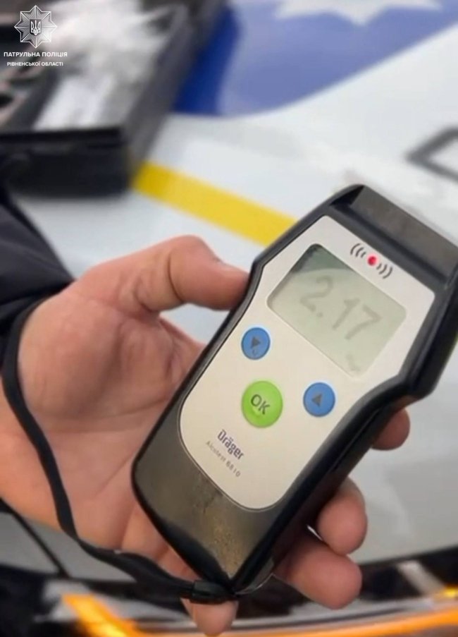 У водія справді були ознаки алкогольного сп’яніння, тому поліцейські запропонували йому пройти огляд за допомогою алкотестера. Результат огляду позитивний: 2,17 проміле.