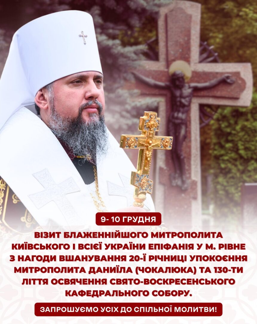 11:30 — буде відслужено заупокійну літiю на місці спочинку митрополита Даниїла (Чокалюка) — архіпастиря, який відіграв важливу роль у духовному становленні Рівненської єпархії.