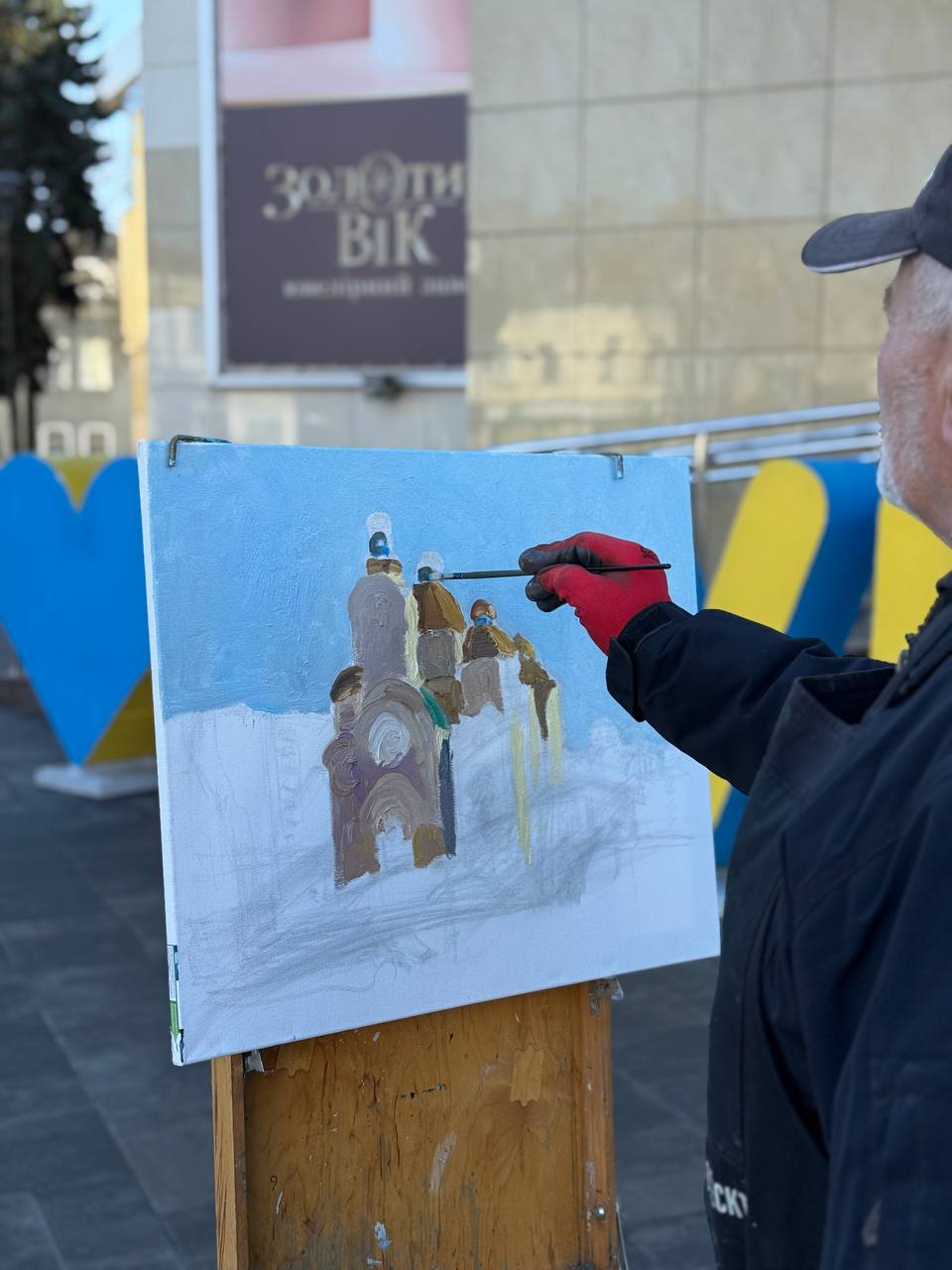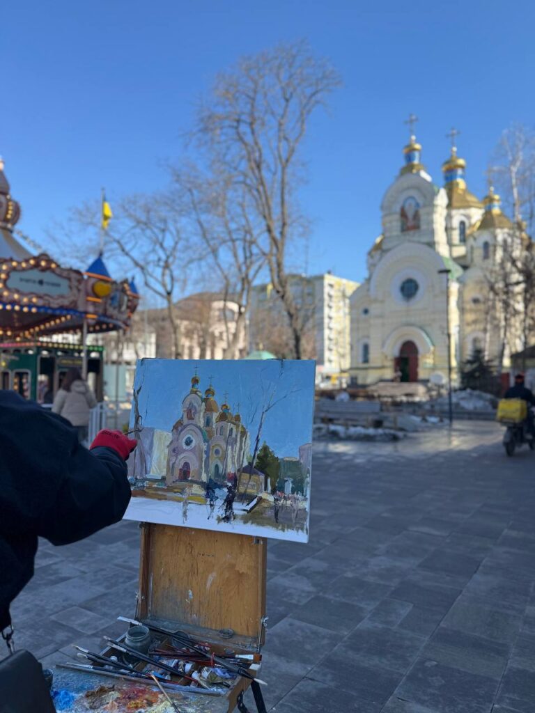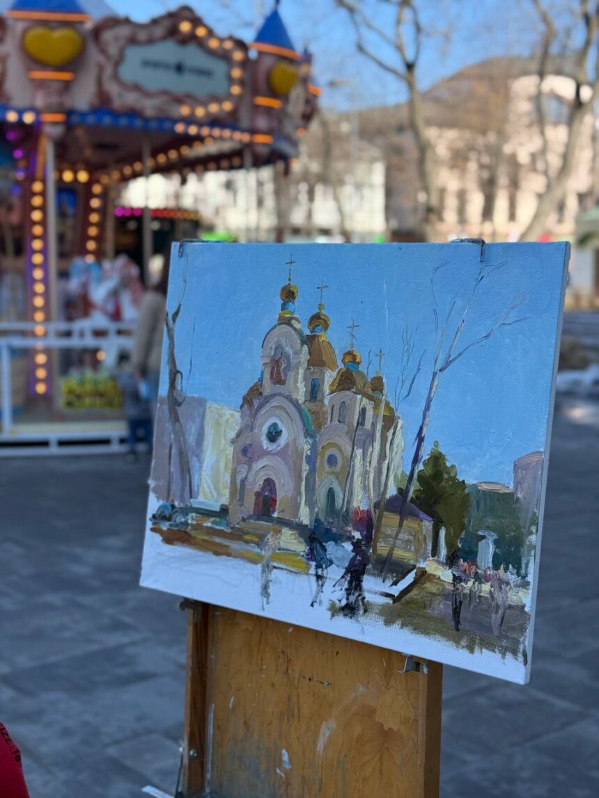 Весняне натхнення біля Злата Плаза: художник Микола Шолудько малював там міський пейзаж із видом на Свято-Воскресенський кафедральний собор.