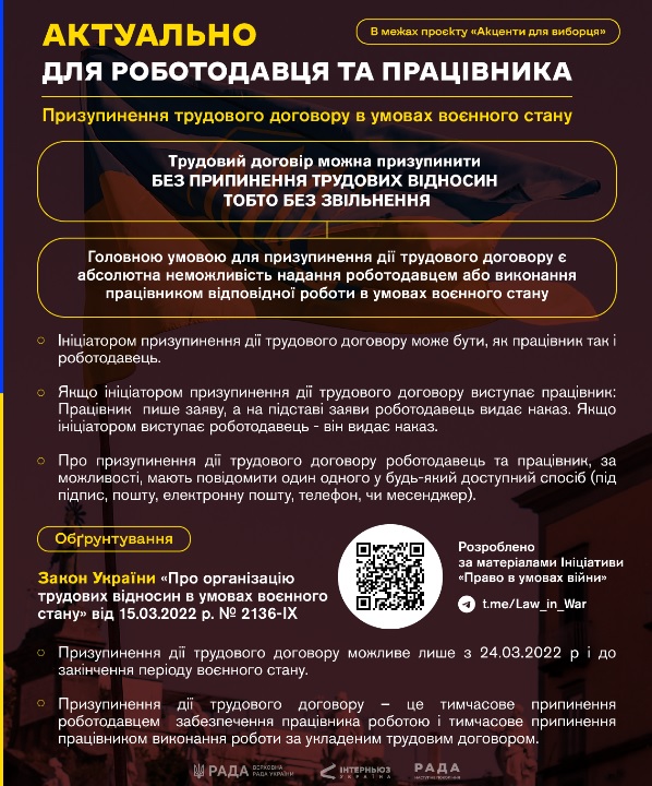 Програма USAID «РАДА: наступне покоління» разом з ініціативою «Право в умовах війни» (сайт, Telegram-канал) ініціювали проєкт «Акценти для виборця». В його межах фахівці у сфері права підготували серію інформаційних матеріалів — вони пояснюють законодавчі зміни, які впливають на громадян в умовах воєнного стану, та актуальні правові питання для підприємців, роботодавців, внутрішньо переміщених осіб і військовослужбовців.