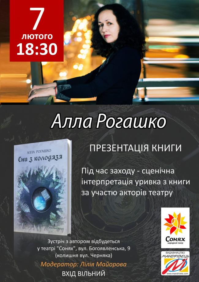 Презентація книги “Сни з колодязя” відбудеться 7 лютого у приміщенні театру “Сонях” за адресою: м. Рівне, вул. Богоявленська, 9 (колишня вулиця Черняка). Початок – о 18.30. Модератор: Лілія Майорова.