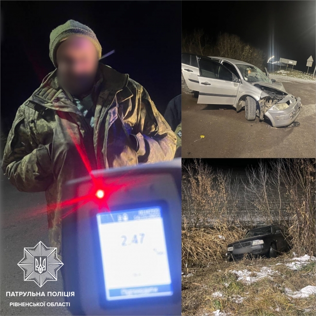 – 41-річний водій Audi не був уважним та не стежив за дорожньою обстановкою. Перед розворотом він не переконався, що це буде безпечним і не створить перешкоди іншим учасникам дорожнього руху, отож допустив зіткнення із автомобілем Renault Megane, який рухався в зустрічному напрямку прямо, – повідомила РВ речниця патрульної поліції Рівненщини Оксана Юрченко. – Коли поспілкувались з водієм-порушником, виявили у нього ознаки алкогольного сп’яніння – було чути запах алкоголю з рота, порушення мови та порушення координації рухів. Водію запропонували пройти огляд на визначення стану алкогольного сп’яніння на місці зупинки авто. Результат огляду – 2.47 проміле. З результатом він був згідний, від проходження огляду в медичному закладі відмовився. Відносно водія було складено протокол за керування авто у стані сп’яніння за частиною 1 статті 30 та протокол за скоєння ДТП за статтею 124 КУпАП.