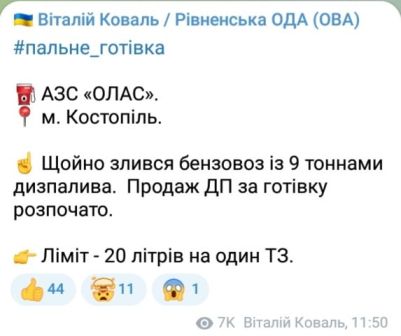 Учора Віталій Коваль повідомив, що увечері у місті Костополі на АЗС «ОЛАС» водії зможуть придбати пальне – по 20 літрів на один транспортний засіб. Продаж мав стартувати о 20:30.