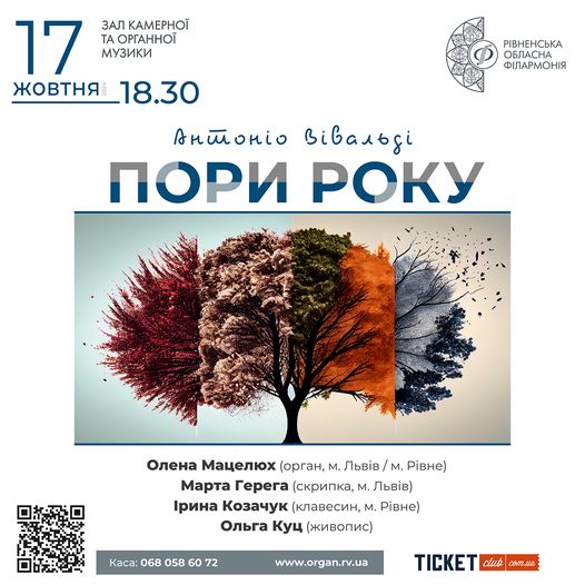 Виконуватимуть “Пори року” талановиті артистки Ольга Мацелюх (орган, м. Львів/Рівне), Марта Герега (скрипка, м. Львів) та Ірина Козачук (клавесин, м. Рівне). Живопис представить Ольга Куц зі Львова.