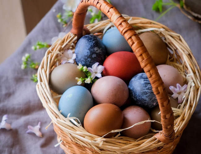 Почистіть і натріть на великій тертці буряк. Залийте літром води та варіть протягом 30 хвилин. За цей час відваріть круто яйця та остудіть. Процідіть готовий буряковий відвар та покладіть у нього яйця. Через дві-три години яйця стануть насиченого вишневого кольору. Дістаньте їх з відвару та просушіть на паперовому рушнику.
