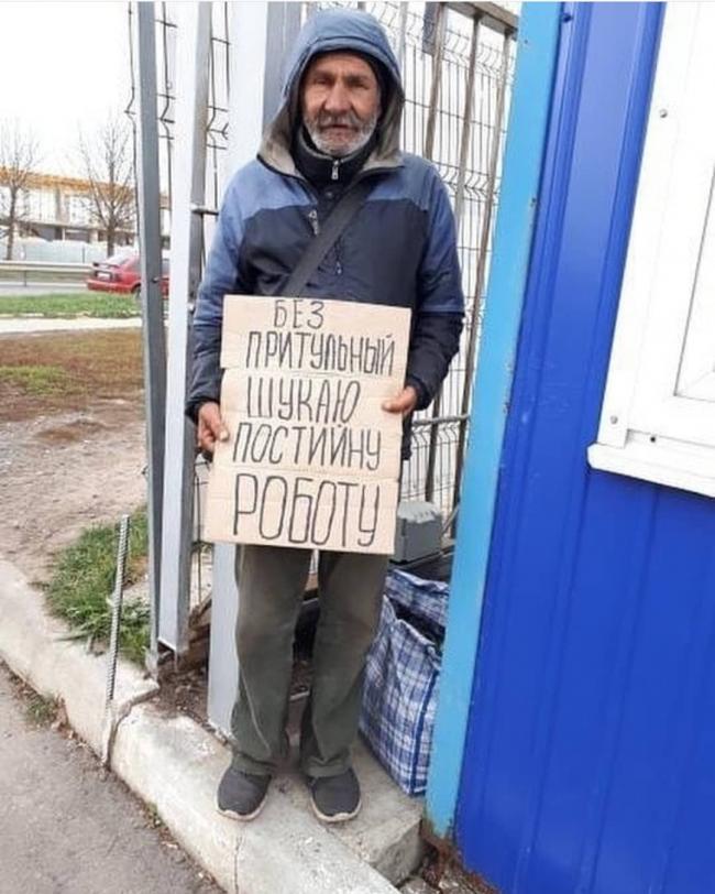 Як повідомляє «rivne_1283», на листі картону в чоловіка напис, що він – безпритульний, але шукає роботу.