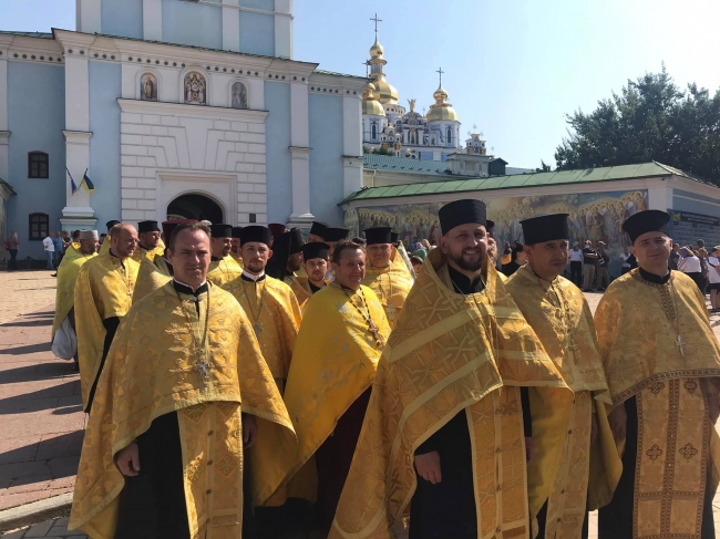 Служба відбулася в Михайлівському золотоверхому соборі, звідки усі вирушили до пам’ятника князю Володимиру на молебень.