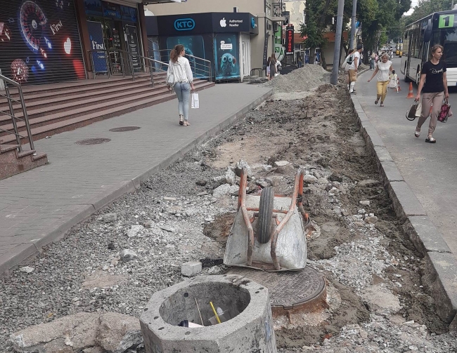 До слова, не так давно перехожим доводилося обходити іншу ділянку Соборної, що неподалік Театральної площі. Там, перед магазинами, частково розібрали стару бруківку. Натомість середину тротуару замостили плиткою. Тож ям на тому проміжку більше немає.