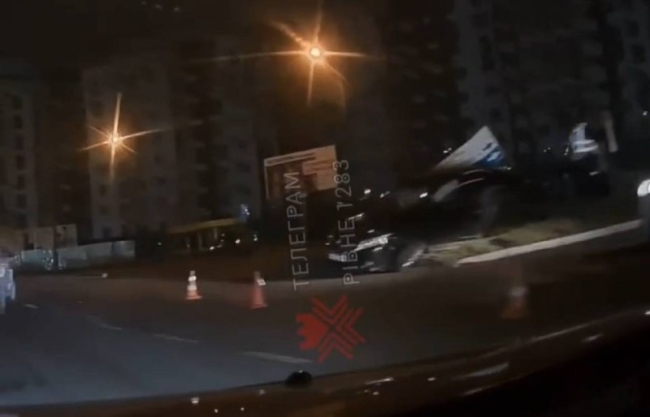 Як видно з відео, яке опублікували в телеграм-спільноті «Рівне 1283», легковик врізався у дорожній знак і вилетів на бордюр.
