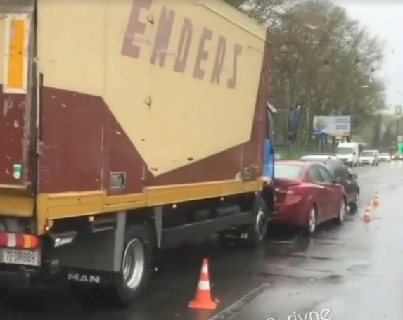 Як видно з «Типового Рівного», вантажний автомобіль врізався у задню частину легкового авто, а те ще в одне авто.