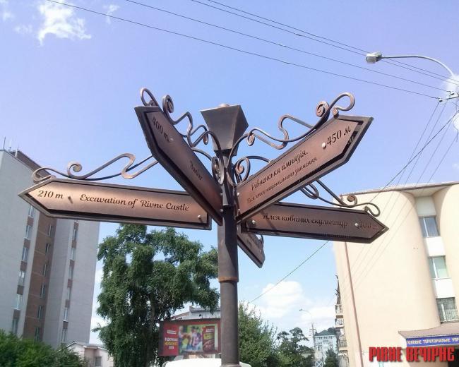 Написи на ньому викарбувані українською та англійською і вказують напрямки до бункера Коха, розкопок рівненського замку, пам’ятника Марії Несвицькій, краєзнавчого музею та алеї скульптур на Лебединці.