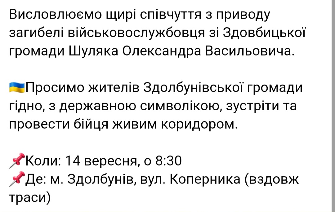 Про загибель воїна повідомили у міській раді Здолбунова. Громаду просять гідно зустріти захисника.