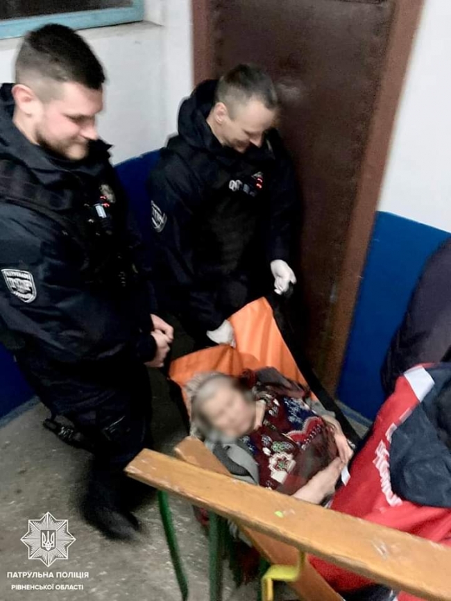 У квартирі поліцейські побачили бабусю, яка лежала на підлозі. Вони викликали швидку та після її приїзду допомогли знести жінку до автомобіля.