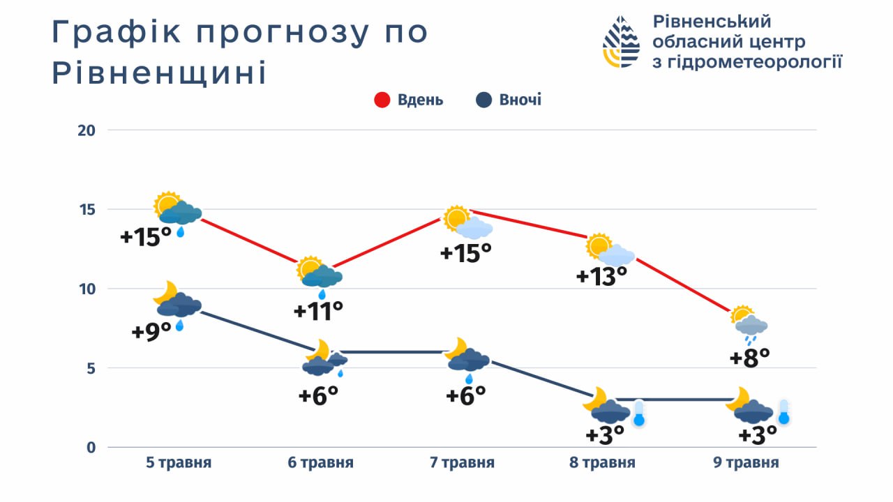 9 травня, п’ятниця: хмарно з проясненнями. Вночі без опадів. Вдень невеликий короткочасний дощ. Вітер східний, 5-10 м/с. Температура вночі 0-5º тепла, на поверхні ґрунту заморозки 0-3°, вдень 6-11º тепла.