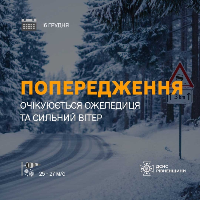 – Увага! За інформацією Рівненського обласного центру з гідрометеорології, протягом доби 16 грудня, очікуються пориви сильного північного-західного вітру 25- 27 м/с. ІІ рівень небезпечності, помаранчевий. Вночі сніг та мокрий сніг, вдень дощ з мокрим снігом. На дорогах ожеледиця. Температура вночі -3,+2°, вдень 3-8º тепла, – повідомляють у ГУ ДСНС Рівненщини.