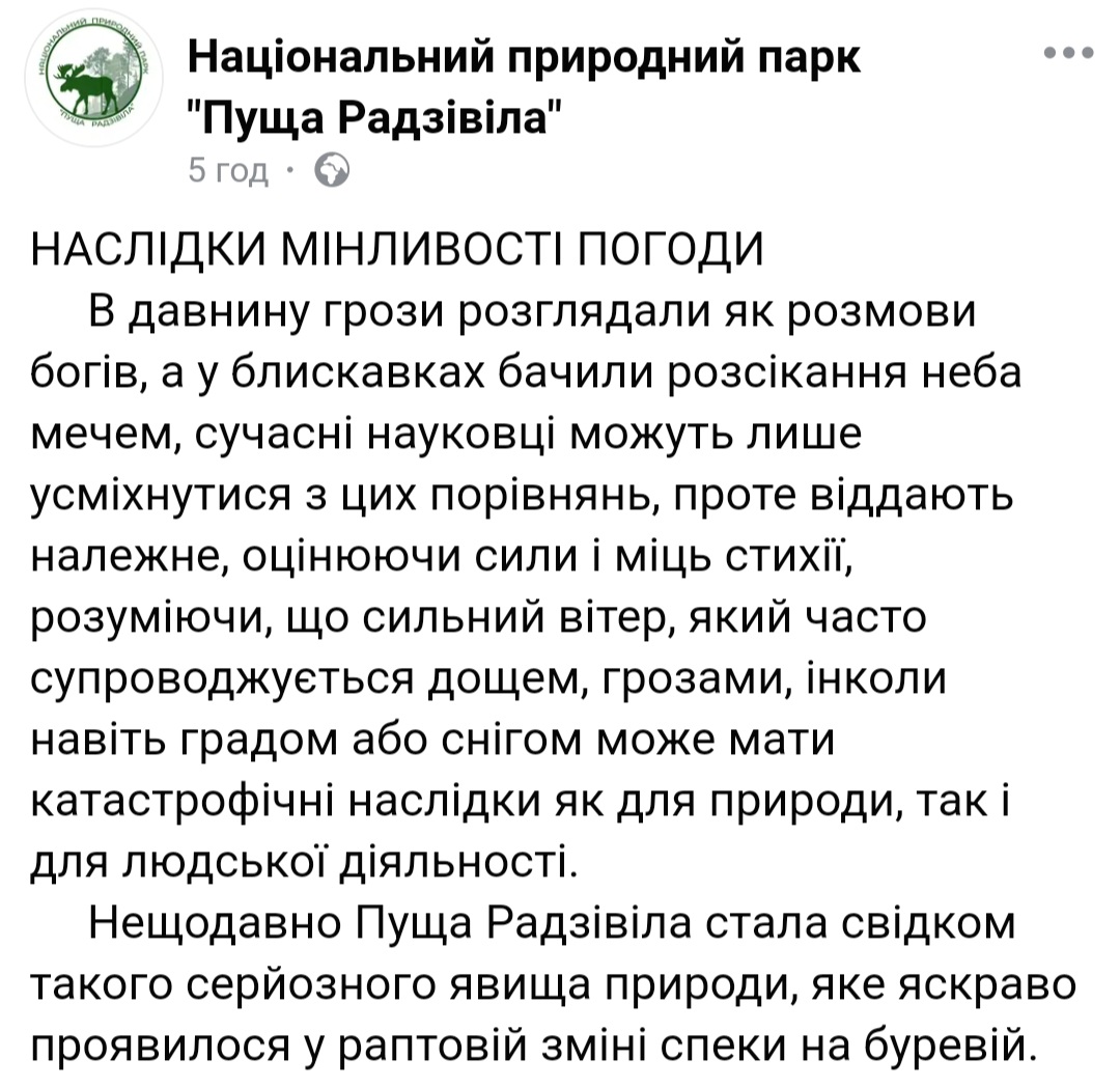 В таку погоду лісом краще не гуляти. Нещодавня негода пройшлася різними районами області. Зокрема, від буревію “дісталося” Національному природному парку “Пуща Радзівіла” у Сарненському районі.