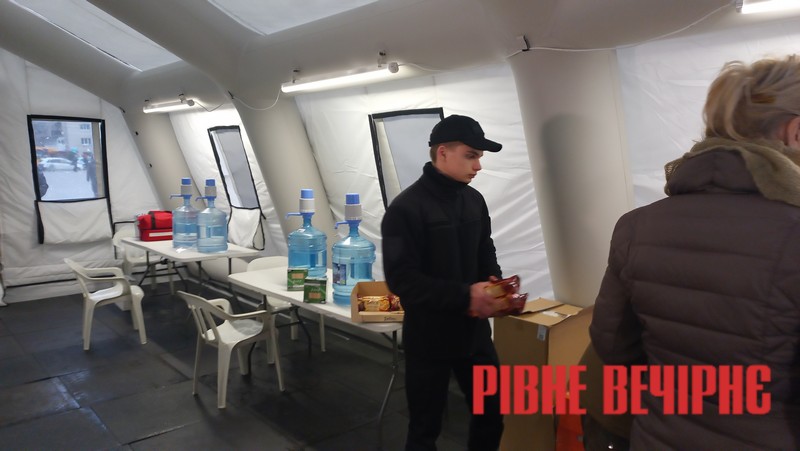 Намет з’явився неподалік “кінопалацу” вранці. Тут працює теплова гармата, тому повітря всередині прогрівається до 20 градусів за Цельсієм. А волонтери вже привезли коробки з печивом та термоси з гарячими напоями.