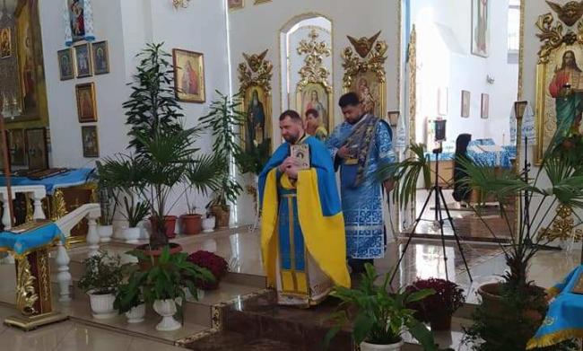 Чернець на святкове Богослужіння одягнув блакитно-жовті ризи, де на спині вишита Україна, а по центру – Матір Божа тримає покрову (покриття) над нашою державою.