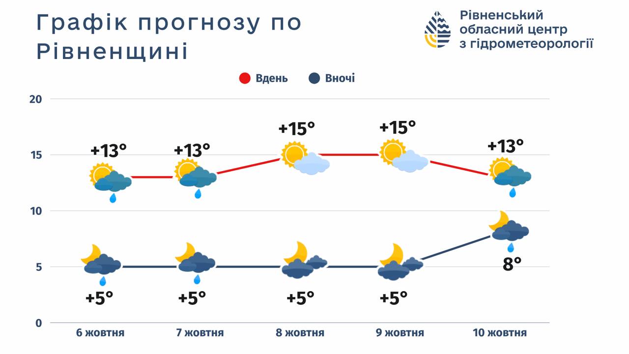 8 жовтня, середа: мінлива хмарність. Без істотних опадів. Вітер північний, 7-12 м/с. Температура вночі 3-8º тепла, вдень 10-15° тепла. Атмосферний тиск буде слабо падати.