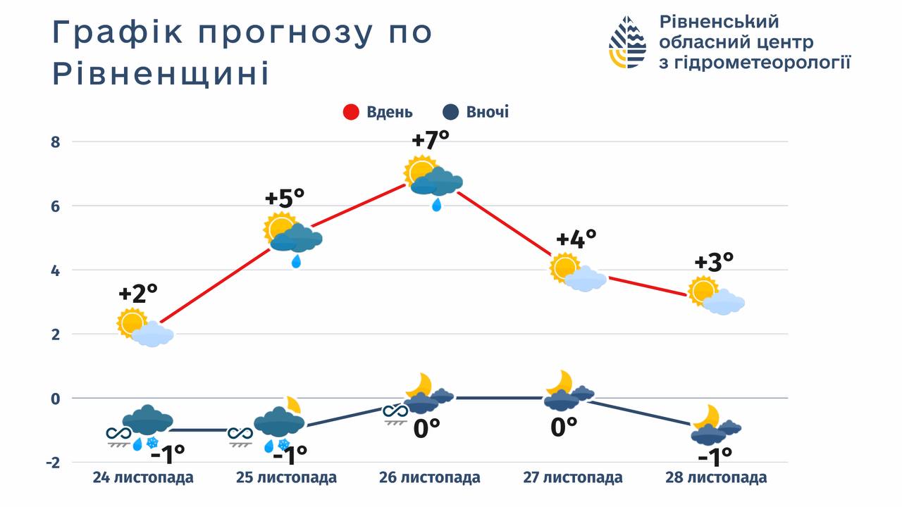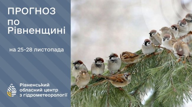 25 листопада, вівторок: хмарно з проясненнями. Вночі та вранці невеликий мокрий сніг та дощ. Вдень невеликий дощ. Вночі та вранці слабкий туман, слабка ожеледь, на дорогах ожеледиця. Вітер південно-східний, південний, 7-12 м/с. Температура вночі від 3° морозу до 2° тепла, вдень 2-7° тепла. Атмосферний тиск буде падати.