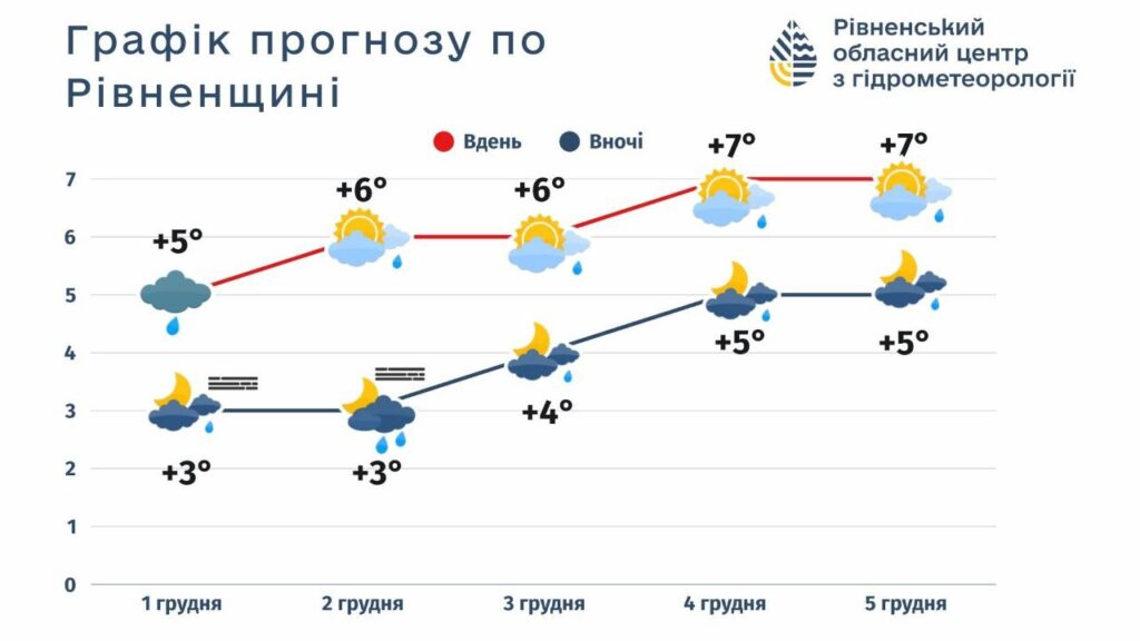 Середа, 3 грудня: хмарно з проясненнями. Без істотних опадів. Вночі та вранці місцями туман. Вітер південно-східний, 5-10м/с. Температура вночі 0..+5°, вдень +2..+7°. Атмосферний тиск суттєво не зміниться.