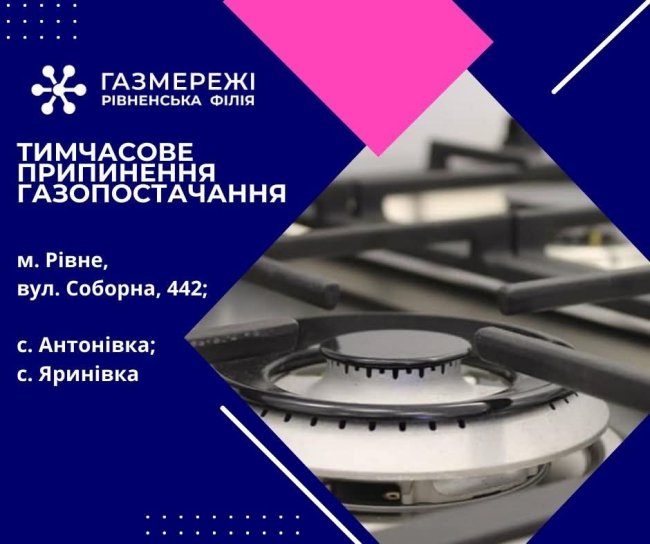 У зв’язку з цим буде тимчасово припинено газопостачання (розподіл природного газу) до осель 60 споживачів природного газу в м. Рівному по вул. Соборна, 442.