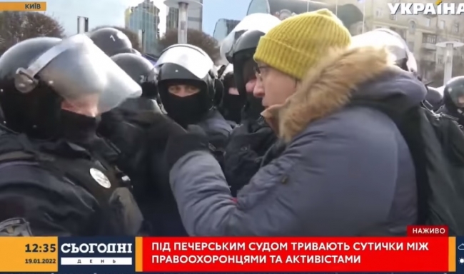 Все це подавалося в ефір з підписом: “Під судом тривають сутички між правоохоронцями та активістами”.