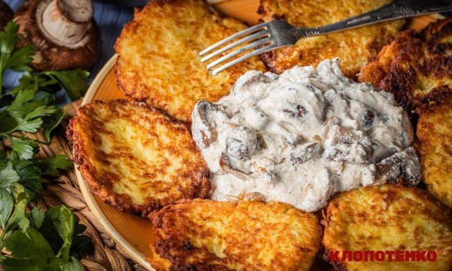 Для підливи: на гарячій пательні обсмажте нарізані чвертями печериці 3–4 хв., додайте цибулю, нарізану кубиками, та смажте разом ще 5 хв. Посоліть та поперчіть, додайте 300 г сметани, перемішайте та зніміть з вогню. Подавайте підливу до гарячих дерунів.