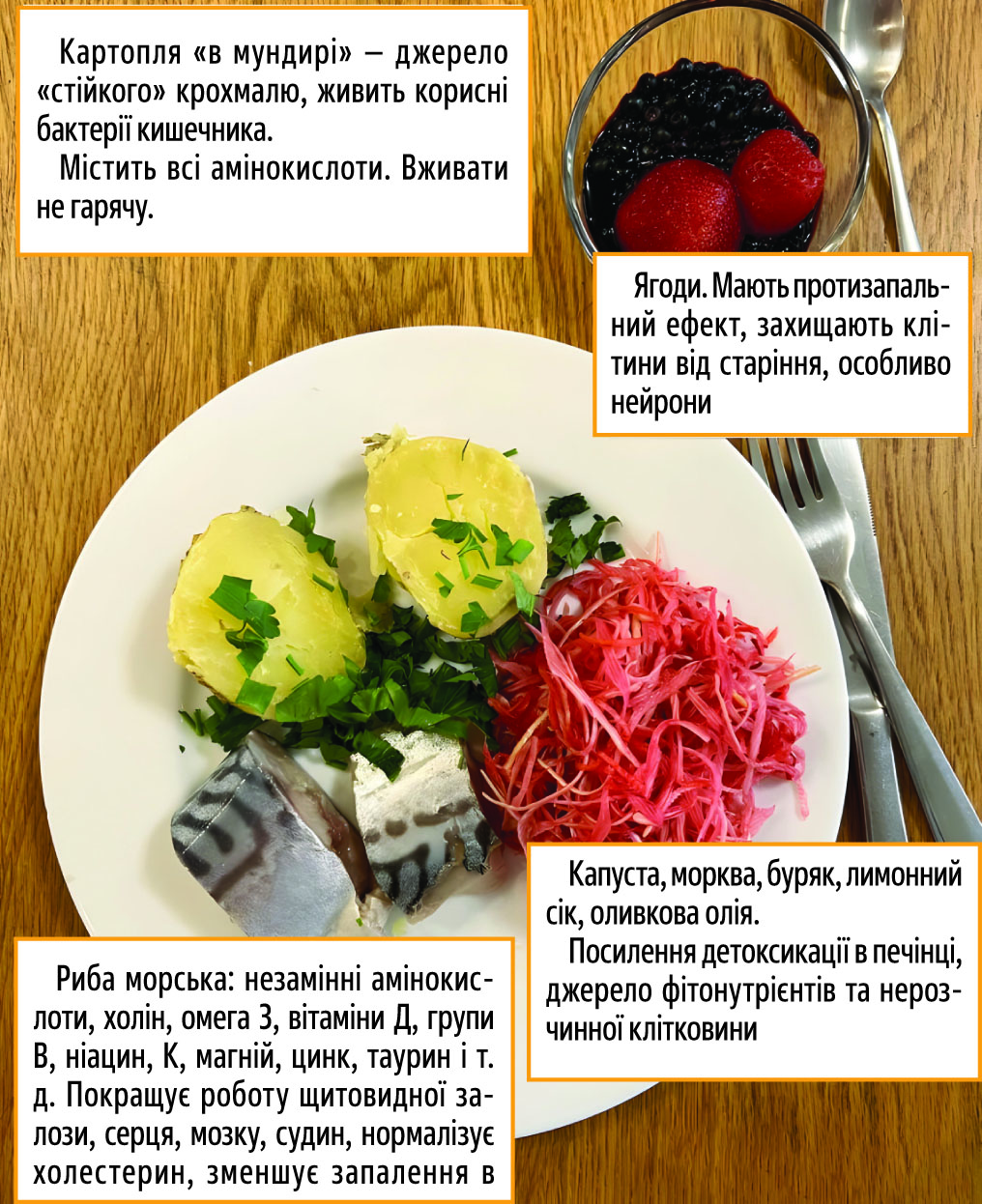 Експерт рекомендує брати зварену в кожушках картоплину, не гарячу, а охолоджену до кімнатної температури, її потрібно розрізати, а поруч покласти шматок жирної скумбрії або оселедця. І доповнити страву салатом зі свіжої чи квашеної капусти. І на десерт — чорні ягоди та чорна кава. І ось чому.