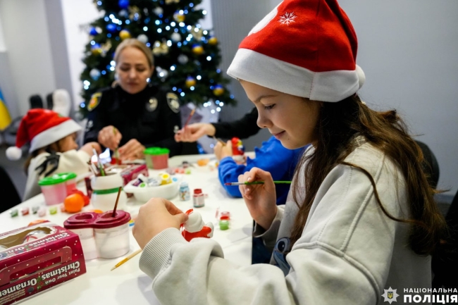 Ялинкові прикраси власноруч створили сини та доньки поліцейських, які загинули, виконуючи свій службовий обов’язок в зоні бойових дій. Старанно розфарбовуючи кожну іграшку, вони наповнювали її любов’ю та вірою в щасливе і мирне майбутнє. А потім, разом з керівником ГУНП Віктором Шанським дітвора прикрасила ними зелену красуню.