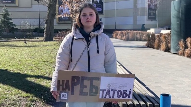 В руках дівчини плакат із написом: “На РЕБ для тата”, а поруч — розмальована гільза, у яку люди кладуть гроші. Так уже майже місяць розпочинає свій день 18-річна Ірина Мартинюк. Вона приходить до Свято-Воскресенського собору у центрі Рівного, аби зібрати гроші для підрозділу, в якому служить її батько.