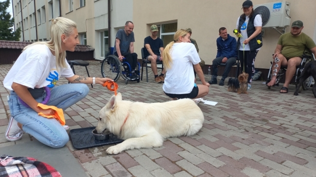 У госпіталь двічі на тиждень приїжджають волонтери-кінологи із спеціально підібраними собаками, які граються або роблять вправи з пацієнтами-військовими. Заняття із собаками позитивно впливає на психологічний стан бійців, і вони стають більш відкритими, знаходять у собі нові сили.