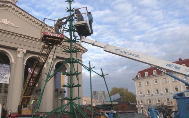 Новорічне дерево уже почали збирати на Театральній площі, повідомляє Суспільне.