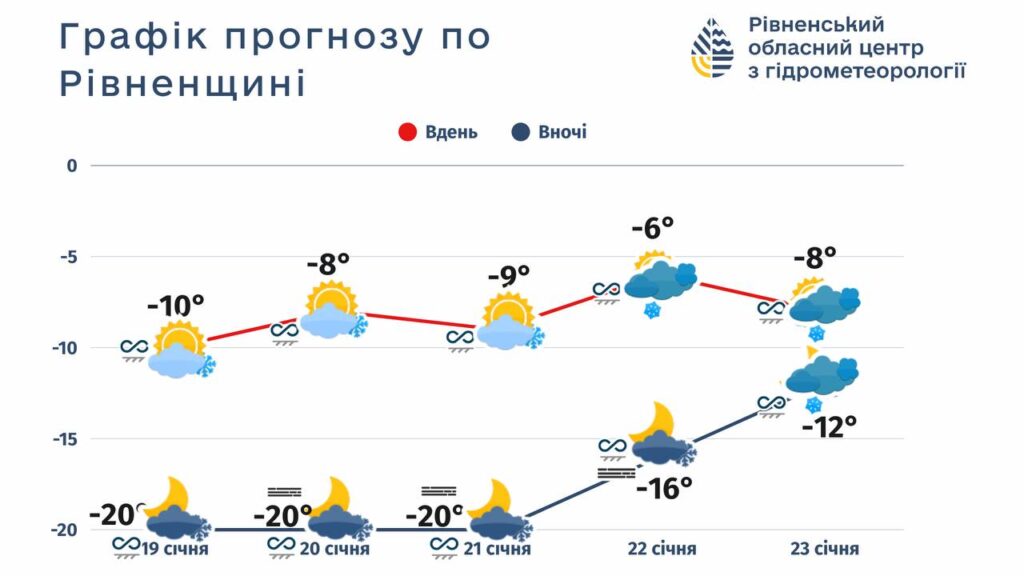 20 січня, вівторок: хмарно з проясненнями. Без істотних опадів. Вночі та вранці туман, слабка паморозь!На дорогах ожеледиця. Вітер південний, 7-12 м/с. Температура вночі 16-21° морозу, вдень 7-12° морозу.