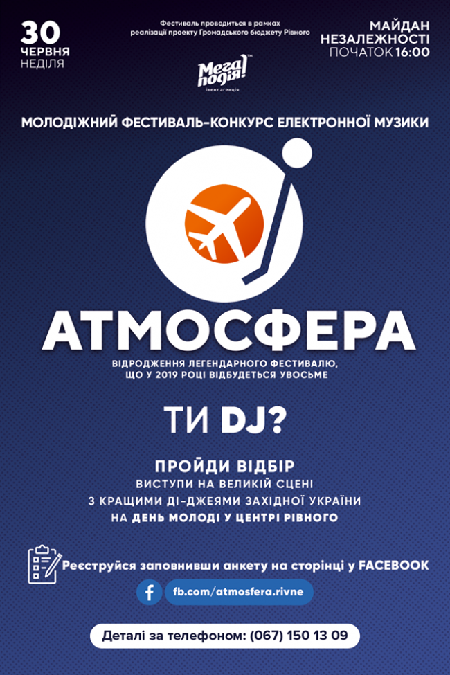 Фестиваль «Атмосфера», повідомляють організатори, проводиться завдяки Громадському бюджету Рівного. На ньому виступатимуть кращі українські діджеї і молоді рівненські виконавці електронної музики. Заявку на участь можна завантажити тут.
