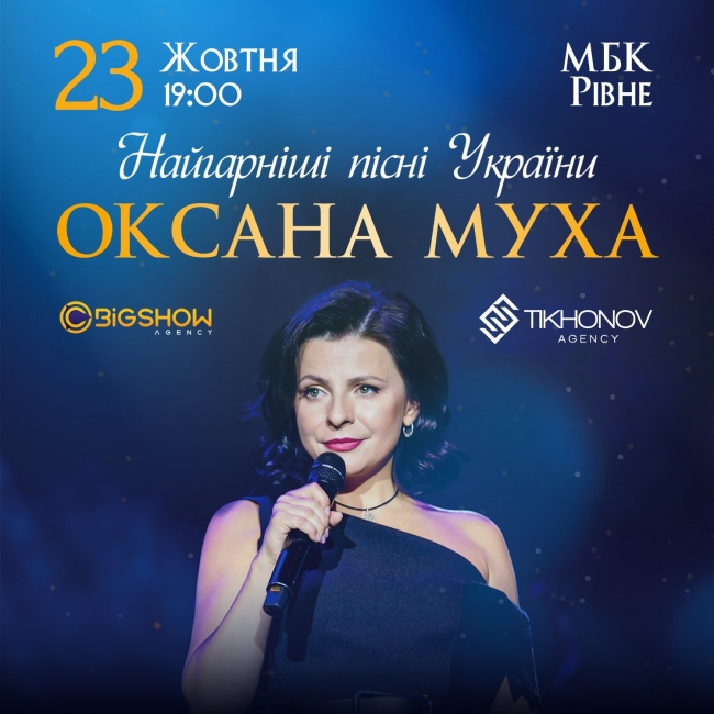 Квитки на сольний концерт Оксани Мухи у Рівному 23 жовтня можна придбати у касі МБК або онлайн.