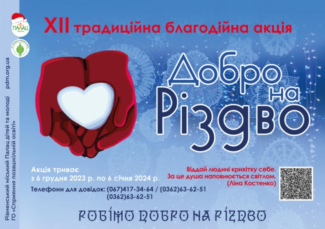 Учасники XІІ традиційної Благодійної акції «Добро на Різдво»: 5-річна Софія Колобаєва, 7-річний Микита Жуковський, 6-річний Денис Гончар, 8-річний Олександр Зоря, 9-річна Валерія Мартинюк та її 9-річний брат Мирослав.Р/Р IBAN 473003460000026005022684001 в АТ «СЕНС-БАНК»