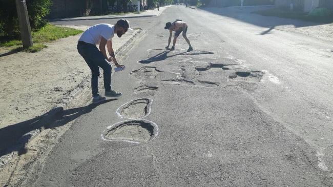 Там водії незадоволені станом головної вулиці міста, тому й обвели вибоїни в асфальті спеціальною білою фарбою. Такою, яку використовують для нанесення розмітки на дорогах.