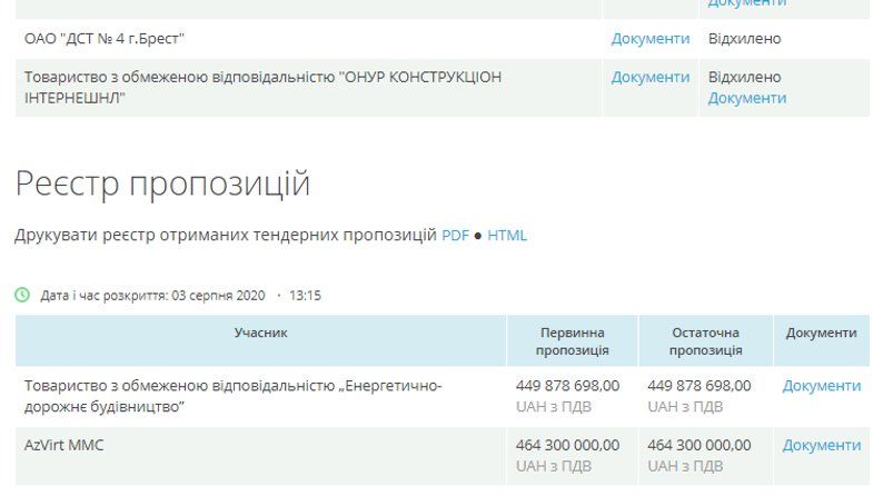Будівельна компанія “Енергетично-дорожнє будівництво” з міста Канів готова завершити будівництво дороги від Рівного до Карпилівського кільця за 449 878 698 гривень. Іншим претендентом була фірма “AzVirt MMC” з Азербайджану. Вона свої послуги оцінила на 15 мільйонів дорожче. Ще двох можливих виконавців робіт ОАО “ДСТ № 4 г.Брест” (Білорусь) та ТзОВ “ОНУР КОНСТРУКЦІОН ІНТЕРНЕШНЛ” (Туреччина) до аукціону не допустили, повідомляє Суспільне.